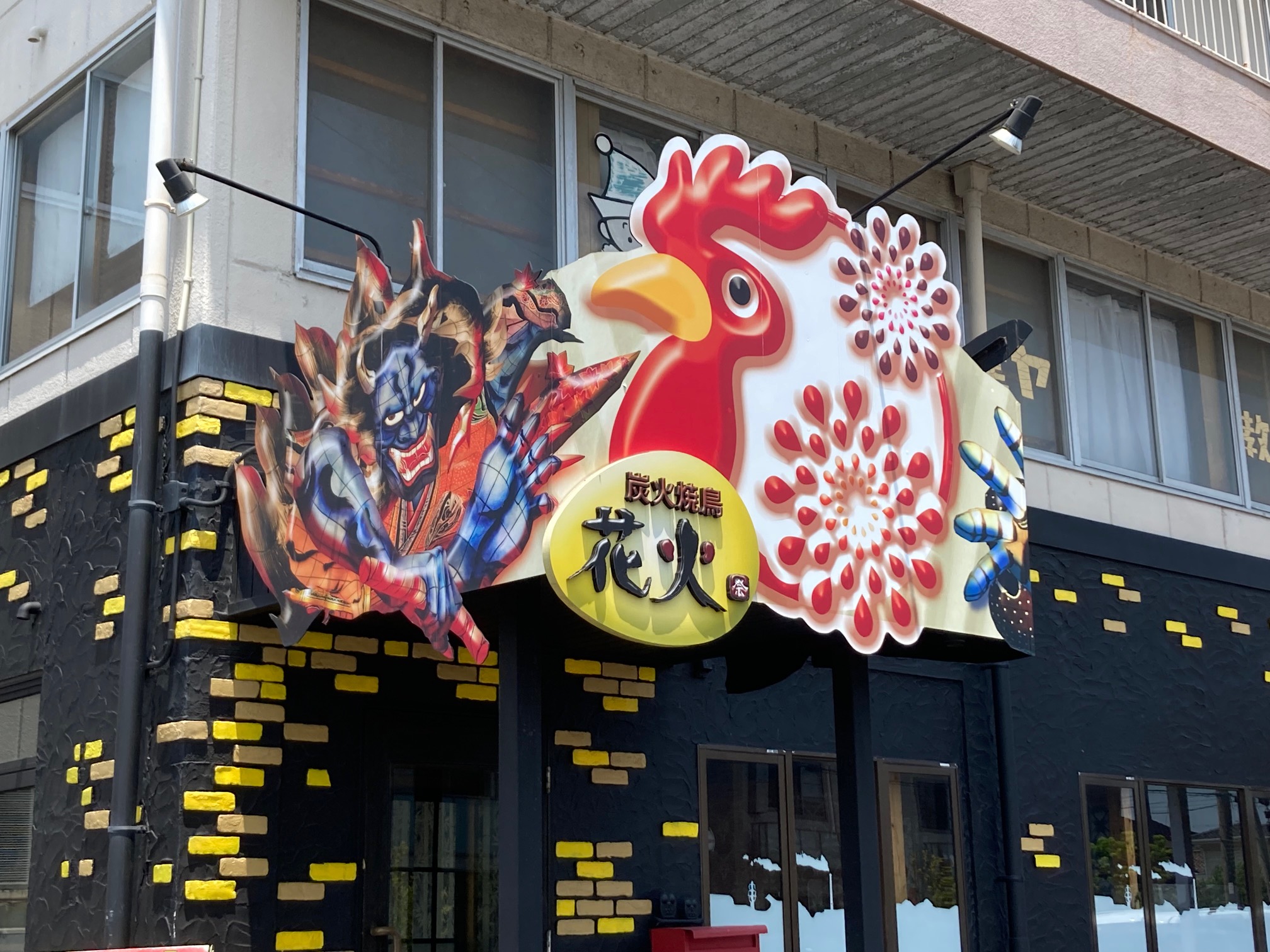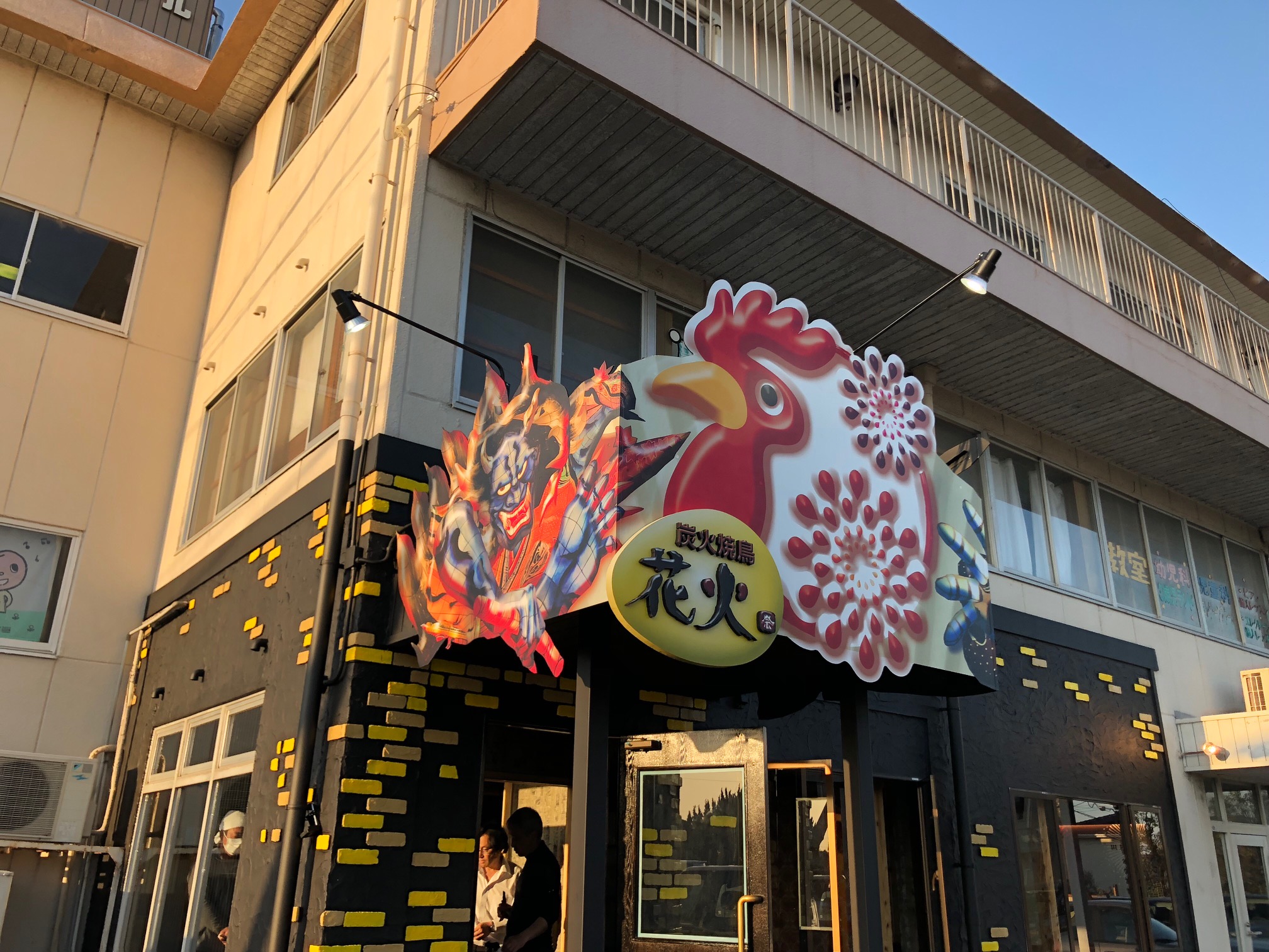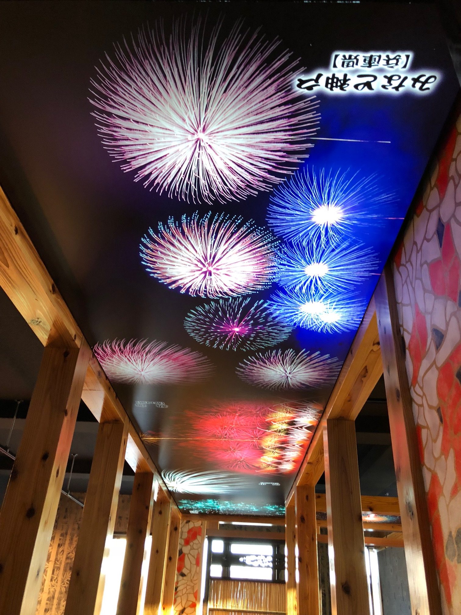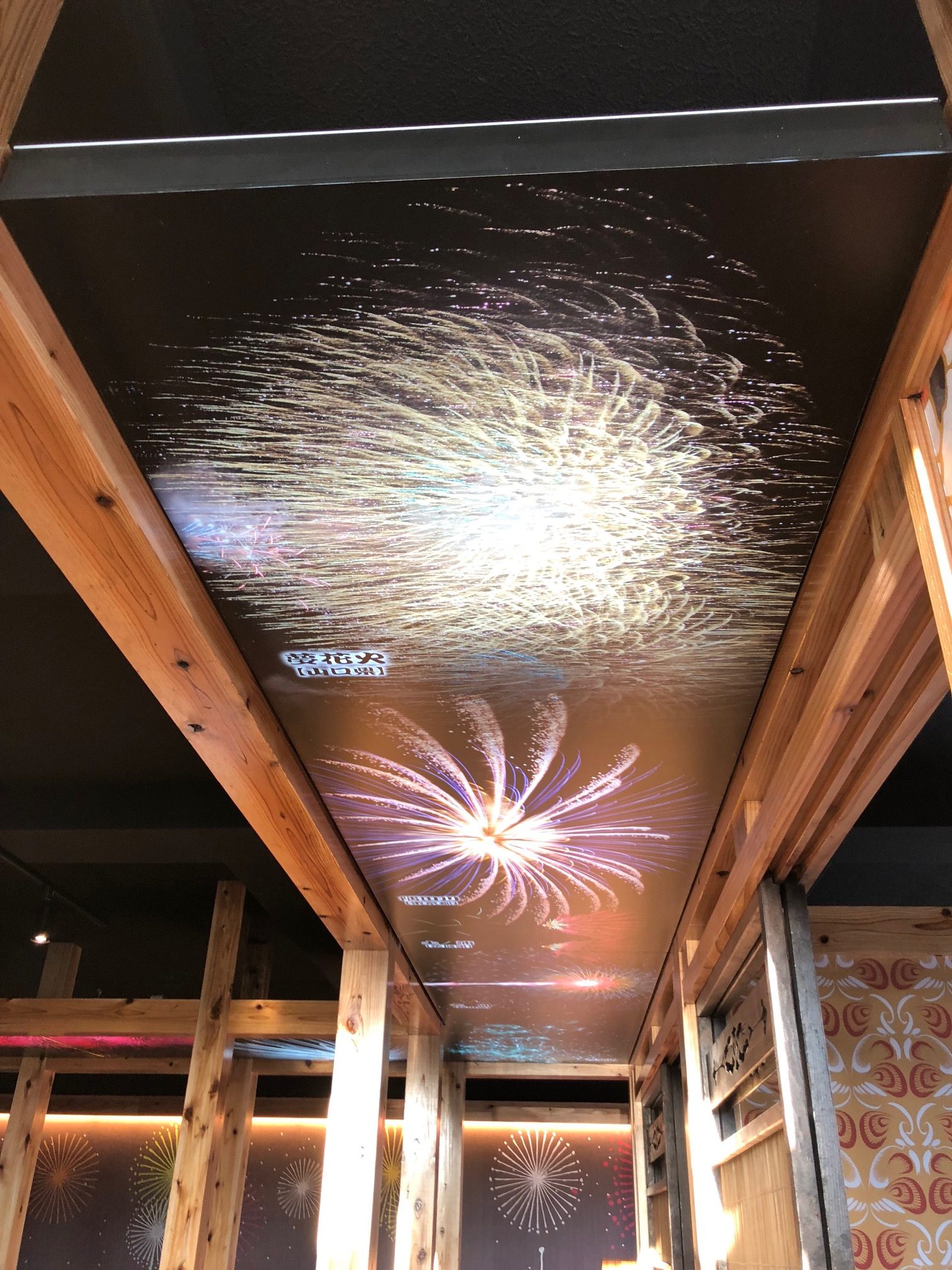 宇部市の炭火焼き鳥店 花火様の看板製作を担当させていただきました。 外観には通行人も思わず振り返るような艶やかなデザインで。 店内天井には店名の花火を連想する、実際の花火の写真を張り付け夏の夜空を再現しました。